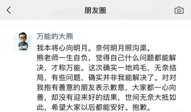 有意思的是,“万能的大熊”自己还在朋友圈发了句“我本将心向明月,奈何明月照沟渠”。