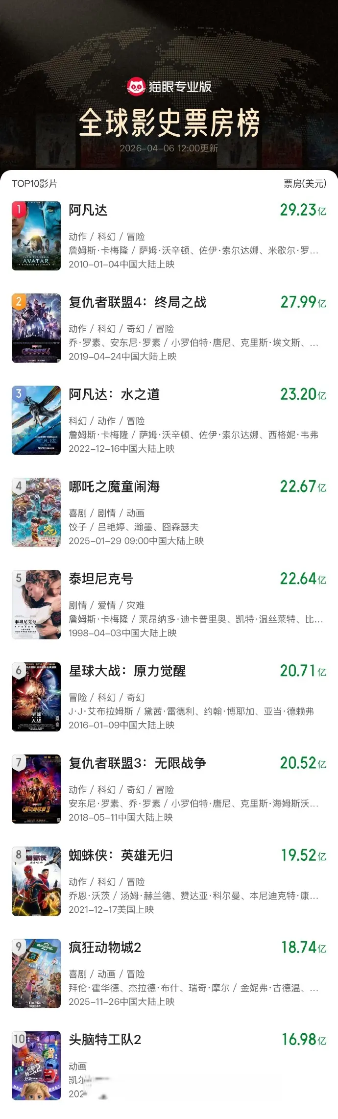 4月8日,据猫眼专业版与Box Office Mojo数据,“成都造”电影《哪吒之魔童闹海》(以下简称《哪吒2》)全球累计票房达22.67亿美元,超越《泰坦尼克号》(22.64亿美元),升至全球影史票房榜第四位。这是该榜单前十中唯一一部亚洲影片,也是唯一一部非好莱坞制作的影片。“成都造”《哪吒2》拾级而上,让人们不禁关注这片数字文创土壤的“生长力”。