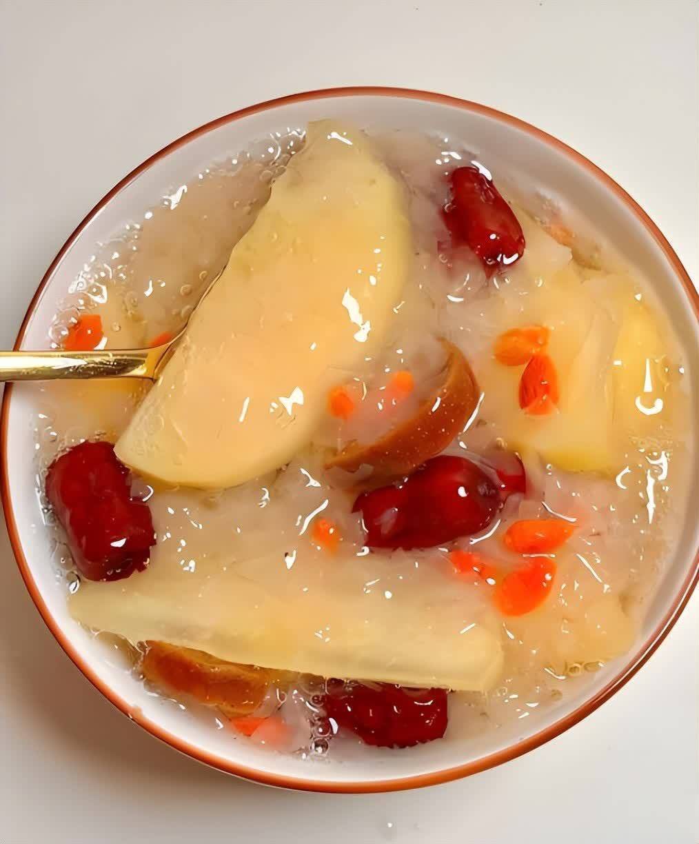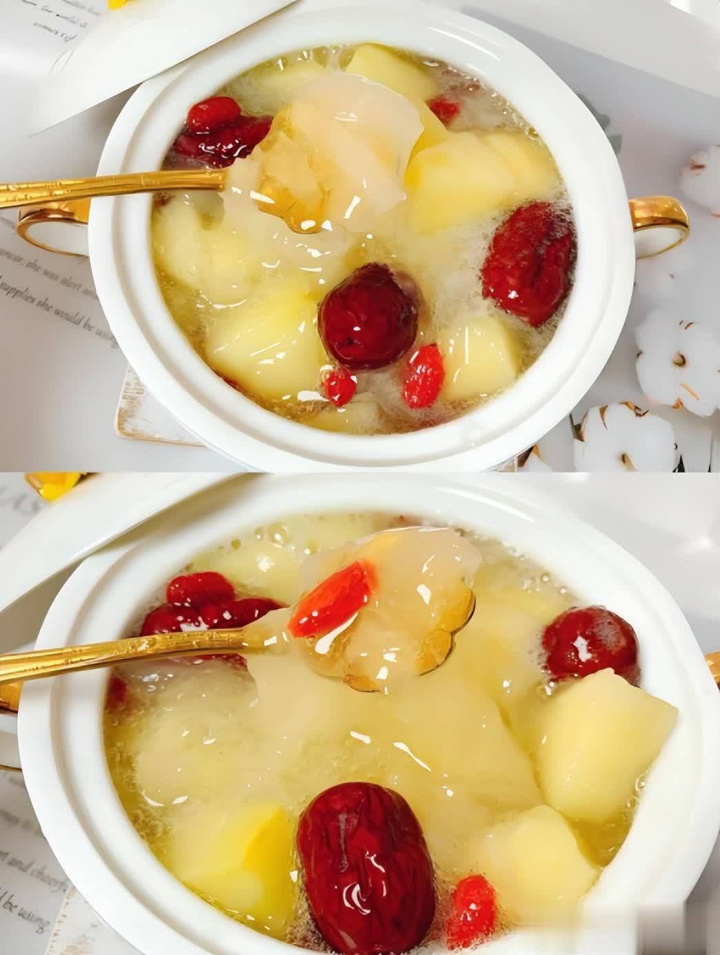 6. 加入苹果和枸杞:当银耳煮至软烂时,加入切好的苹果块和枸杞,再次加热至水开,继续小火煮约10分钟,让苹果的甜味融入汤中。
