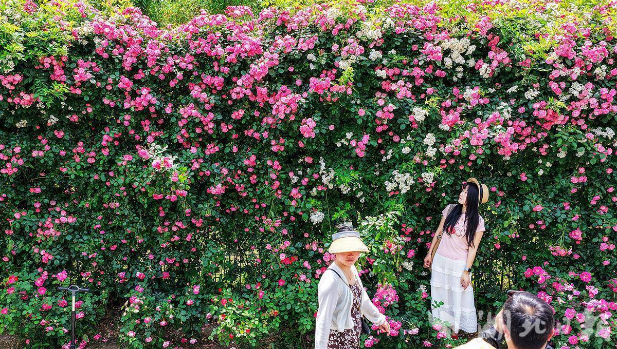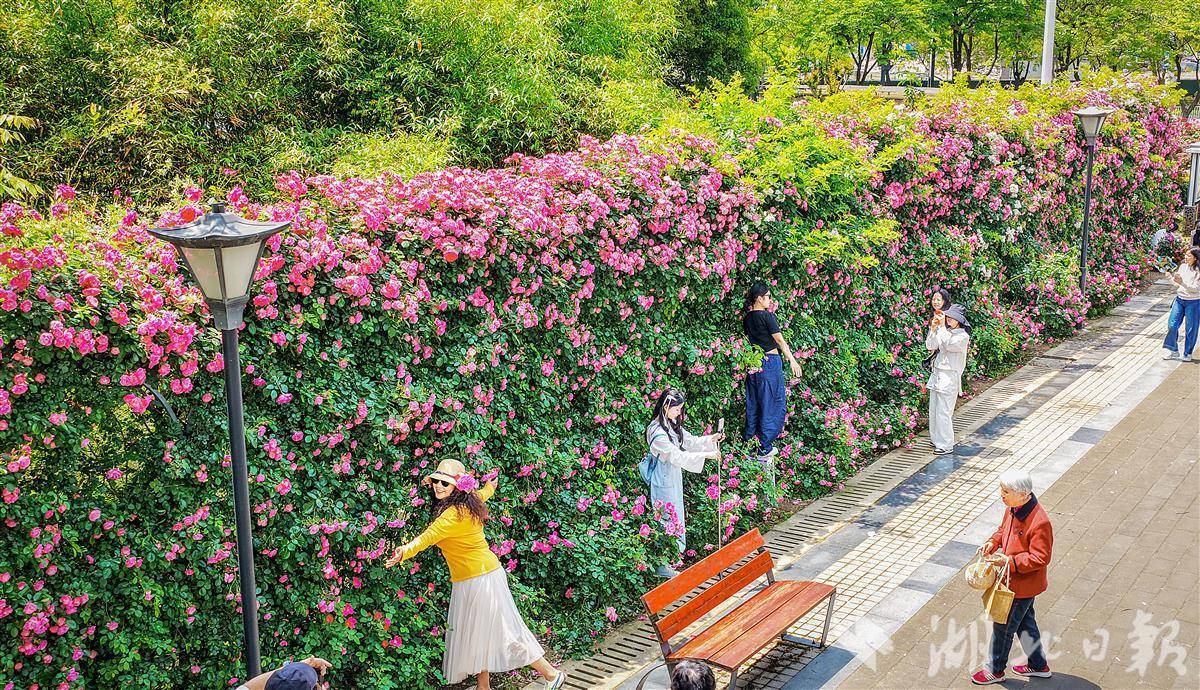 4月25日,武汉市杨春湖湿地公园的蔷薇花墙迎来盛花期,市民游客在花墙下打卡。