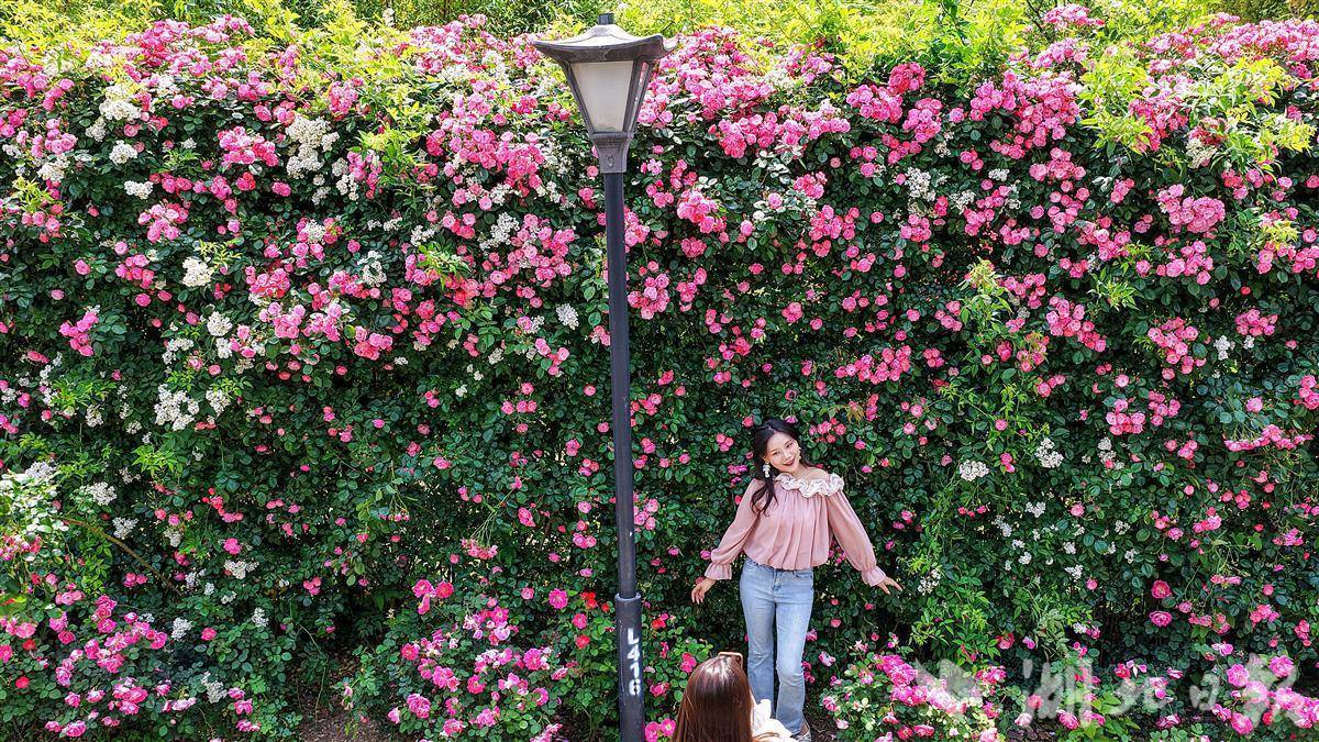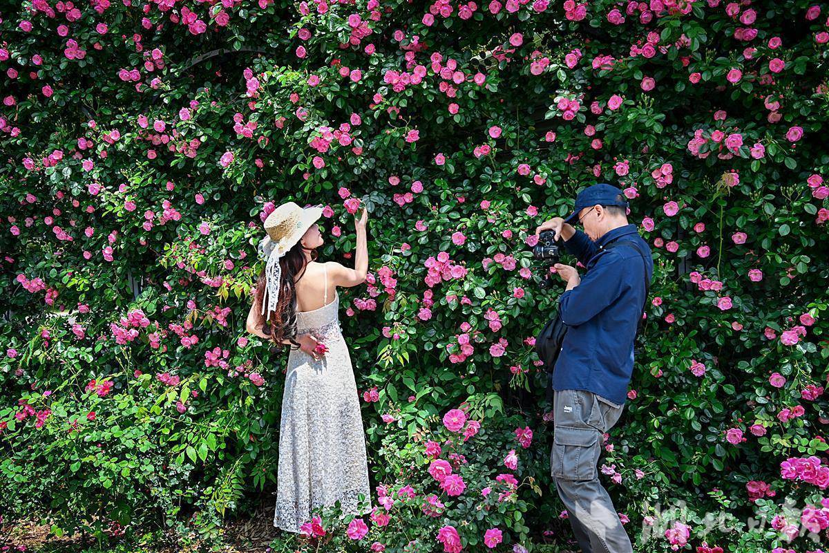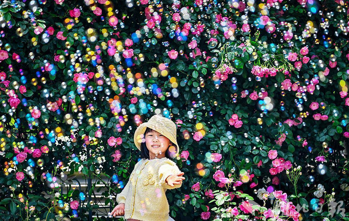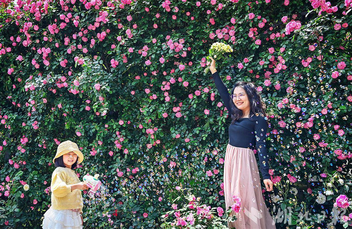 4月25日,武汉市杨春湖湿地公园的蔷薇花墙、月季花园等近百个品种的月季花、蔷薇花绽放,将整个公园装点成一片色彩斑斓的花海,吸引了众多游人前来赏花。特别是大面积的蔷薇花盛开,把高约3米的墙装扮成粉色,使蔷薇花墙呈现出几分浪漫色彩。(湖北日报全媒记者 朱熙勇 摄)